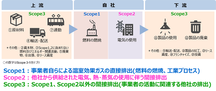 企業活動から排出されるGHGは、下図のように、Scope1(自社からの直接排出)・Scope2(他社から供給されたエネルギーによる間接排出)・Scope3(Scope1・2以外の間接排出)に分けられます。