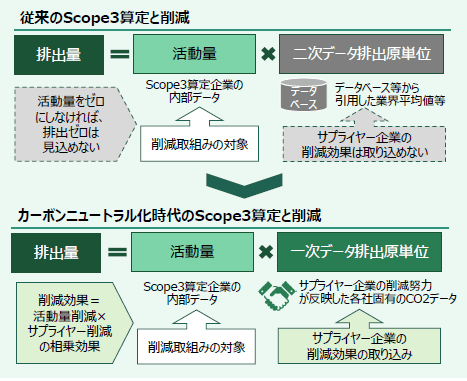 自社の燃料や電力の消費量データと、物理量ベースの排出原単位(kgCO2e/kWhなど)を元に、比較的正確に計算できるScope1・2とは異なり、Scope3の正確な計算には、取引先が使用している原材料・エネルギーなどの種類や消費量のデータが必要となるため、これまで、Scope3の計算には、会計データと、金額ベースの排出原単位(kgCO2e/円など)が広く用いられてきました。