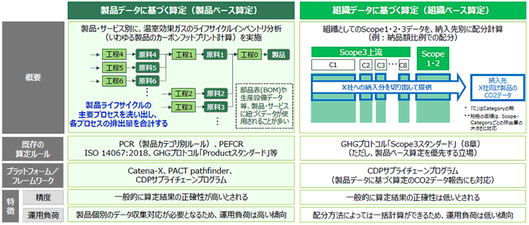 一方、左側の「製品ベース算定」は、製品のカーボンフットプリント(Carbon Footprint of Product;CFP)に相当するもので、ある製品について、使用される原材料や製造プロセスを特定し、各製造プロセスからのGHG排出量を積み上げて計算されるため、製品に直接紐づいた正確な排出原単位となります。