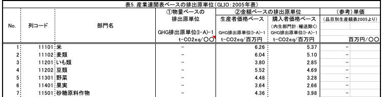 金額ベースの排出原単位は、国立環境研究所が開発した「産業連関表による環境負荷原単位データベース(3EID)」に基づくもので、環境省が提供している「サプライチェーンを通じた組織の温室効果ガス排出等の算定のための排出原単位データベース」で提供されている排出原単位も、これに基づいています(下表)。