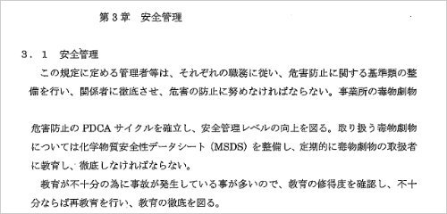 危害防止規定は、毒物劇物製造所等における毒物又は劇物の管理・責任体制を明確にし、もつて毒物又は劇物による保健衛生上の危害を未然に防止することをねらいとした、事業者の自主的な規範であること。