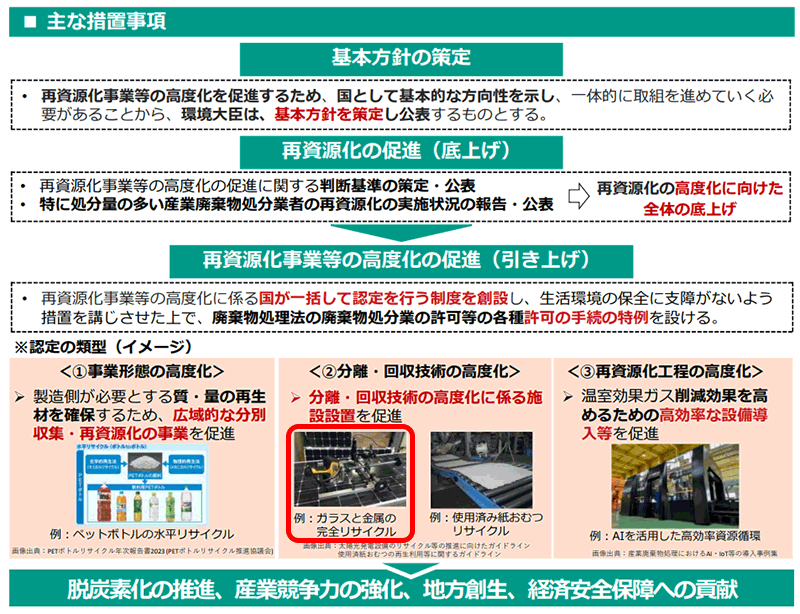 法律の中では、「分離・回収技術の高度化」を促進するための認定制度が定められており、以下の環境省の概要資料では、太陽光パネルのリサイクルについても言及されています。