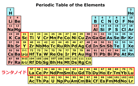 具体的には次の周期表の赤枠で囲まれた元素になります。