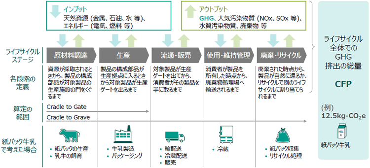 CFP(Carbon Footprint of Product;製品のカーボンフットプリント)とは、製品・サービスの原材料調達から廃棄、リサイクルに至るまでのライフサイクル全体を通したGHG排出量を、CO2排出量として換算した値のことです。