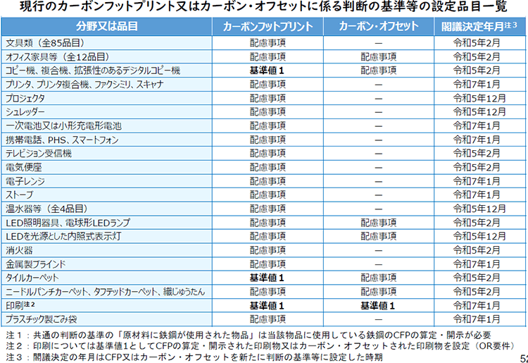 「グリーンであること」を示す指標には、リサイクル率やエコマークなど、様々なものがありますが、下表のとおり、多くの分野・品目において、CFPの算定・開示が指標となっており、今年度は新たに繊維製品を中心とした24品目が追加される予定です。このような国等の優先調達により、低CFP製品の需要が喚起され、普及していくことが期待されます。