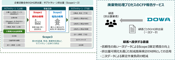 業界初となる廃棄物処理プロセスのCFP報告サービスは、DOWAエコシステムグループに廃棄物処理を委託している顧客を対象に、処理プロセスにおける実データを用いて顧客ごとのGHG排出量を算定し、有償で提供するものです。