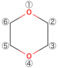 1,4-ジオキサンの1と4は、酸素の場所を示しています。