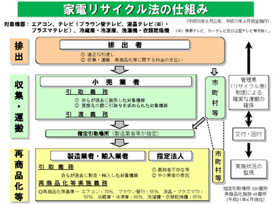 http://www.rkc.aeha.or.jp/img/price/ryoukin2013.pdf - 家電量販店などの小売業者は過去に販売した対象機器や買換時に引取りを求められた対象機器を排出者(消費者)から引き取らねばなりません。