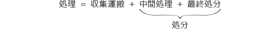 「処理」という言葉が出てきます。廃棄物処理法において「処理」とは、廃棄物が発生してから最終的に捨てられるまでの行為、すなわち、分別、保管、収集、運搬、再生、処分等を含む概念です(廃棄物処理法1条参照)。また、「処分」には、「中間処理」と、「最終処分」の二つの意味が含まれています。中間処理と最終処分を指す場合には、「処分」という言葉が使われます。