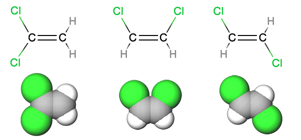 左から、1,1-ジクロロエチレン、シス-1,2-ジクロロエチレン、トランス-1,2-ジクロロエチレン