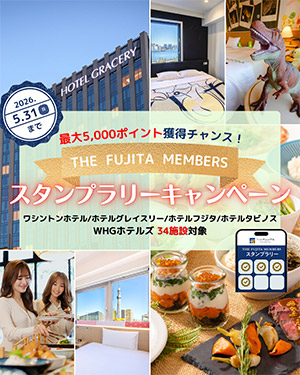 2025年6月1日から2026年5月31日まで全国34のWHGホテルズにおいて、日頃ご愛顧いただいているお客様への感謝の気持ちを込めて、最大5,000ポイントを獲得できる「THE FUJITA MEMBERSスタンプラリーキャンペーン」開催いたします。この機会に全国のWHGホテルズを巡り、特別な旅の思い出を作りませんか?