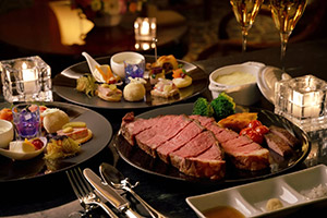 気品あるマホガニー調に統一された店内で、オードブルやシェフ特製のローストビーフとともに、乾杯用のスパークリングワイン1杯とお好みのドリンク2杯をお楽しみいただけるプラン。オーロラをイメージしたメニューなど季節感あふれる贅沢な美味をご用意しています。