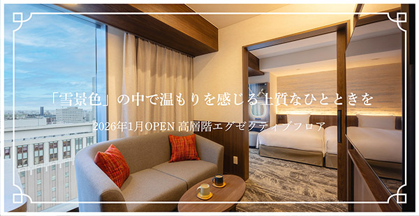 ホテルグレイスリー札幌の客室リニューアルを記念し、THE FUJITA MEMBERS限定「北海道を感じる贅沢プラン」を販売しております。ご宿泊のお客さまは新しくなったロビーやエグゼクティブラウンジをご利用いただけます。特典として、道南・厚沢部町産ヒバのウッドチップを使用した香り袋とオリジナルブレンドのドリップコーヒーをプレゼントいたします。