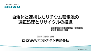 リチウム蓄電池およびリチウム蓄電池を使用した製品の適正処理や再資源化について、DOWAエコシステム株式会社のこれまでの事業内容や、自治体と連携した独自の取り組みなどをご紹介します。※本論文は全国都市清掃会議の機関誌「都市清掃」第78巻 第388号 に掲載された内容です。